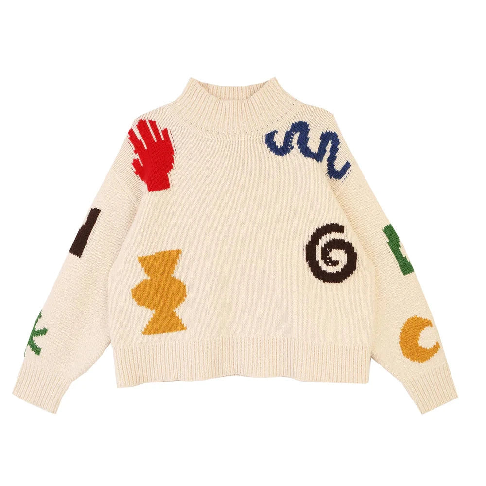 The Miro Knit is a relaxed, slouchy fit jumper with a high neckline and wide ribbed cuffs, designed with room for layering in mind. Crafted from a wool blend, with vibrant multi-coloured intarsia motifs dotted all over an ecru base.