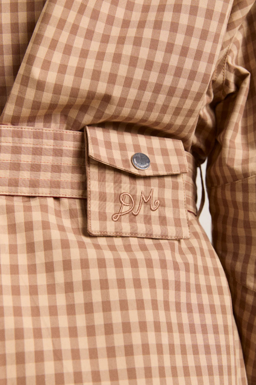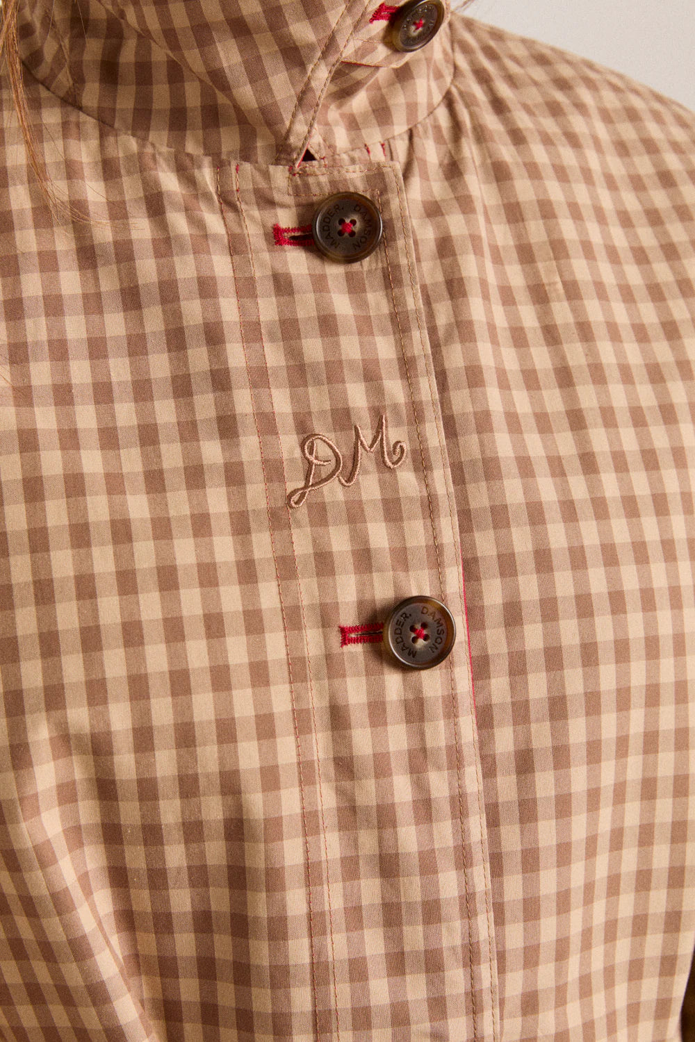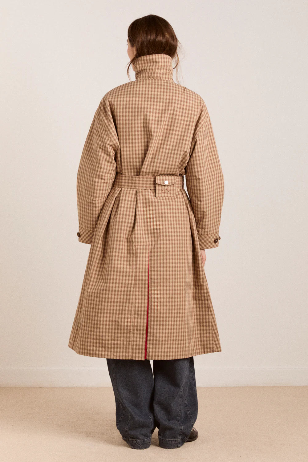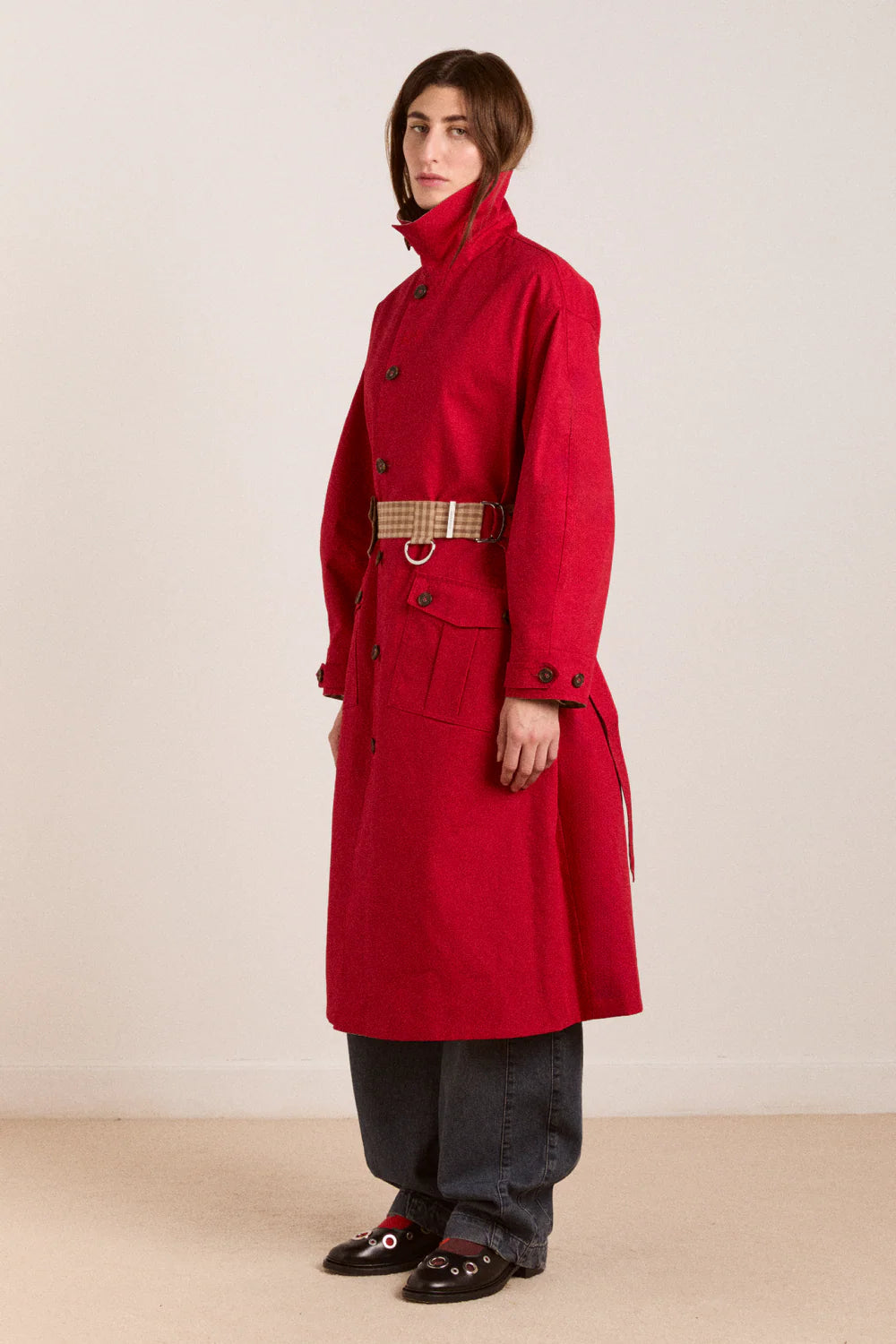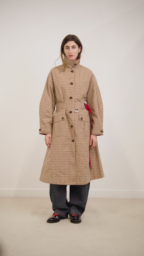 Meet the trench that does the most. The Anja Honey Trench is fully reversible and shower-proof, giving you two looks in one: a tan gingham moment on one side and bold solid red on the other whilst protecting you from the elements.  Crafted from 100% organic cotton, it’s designed with considered detailing throughout.