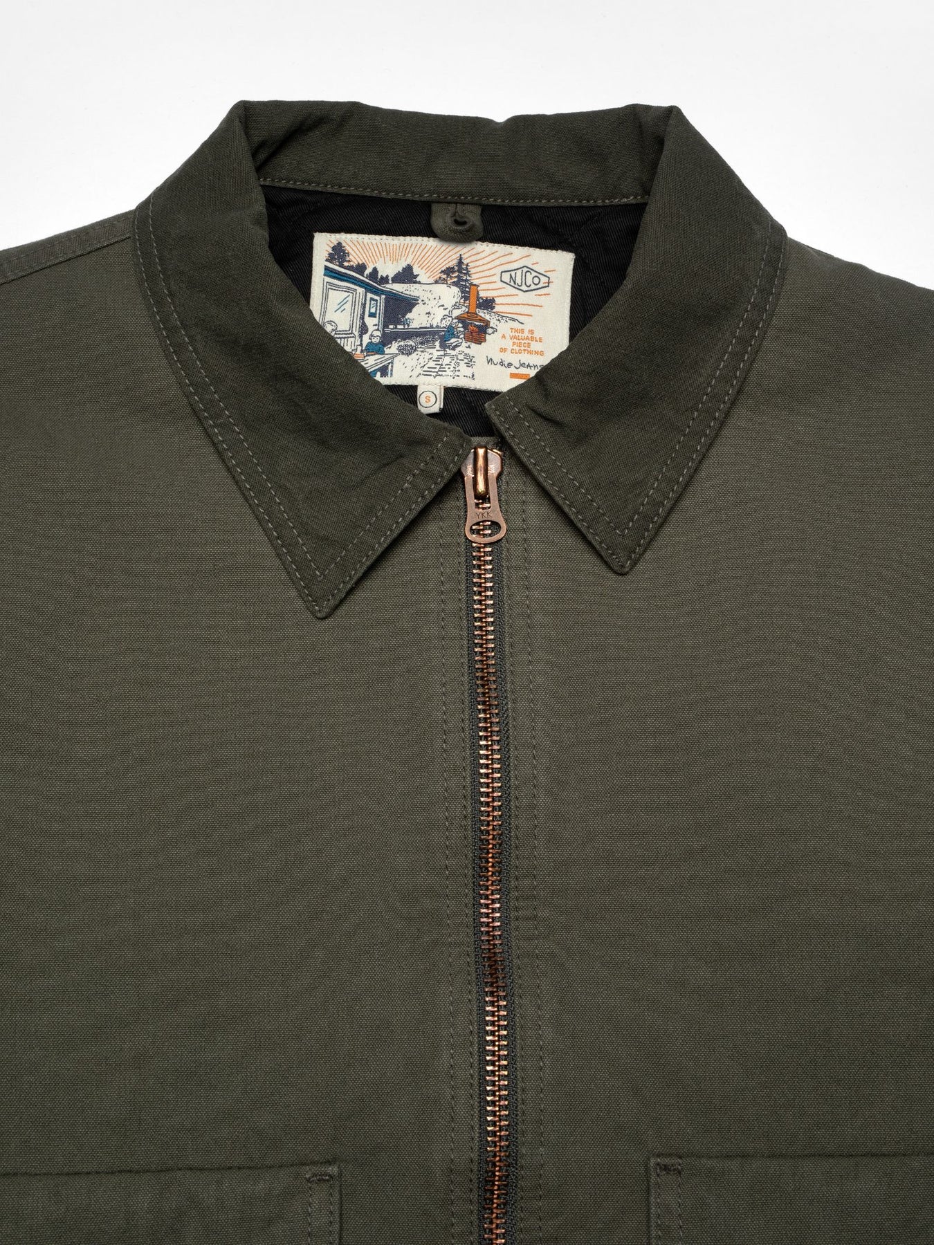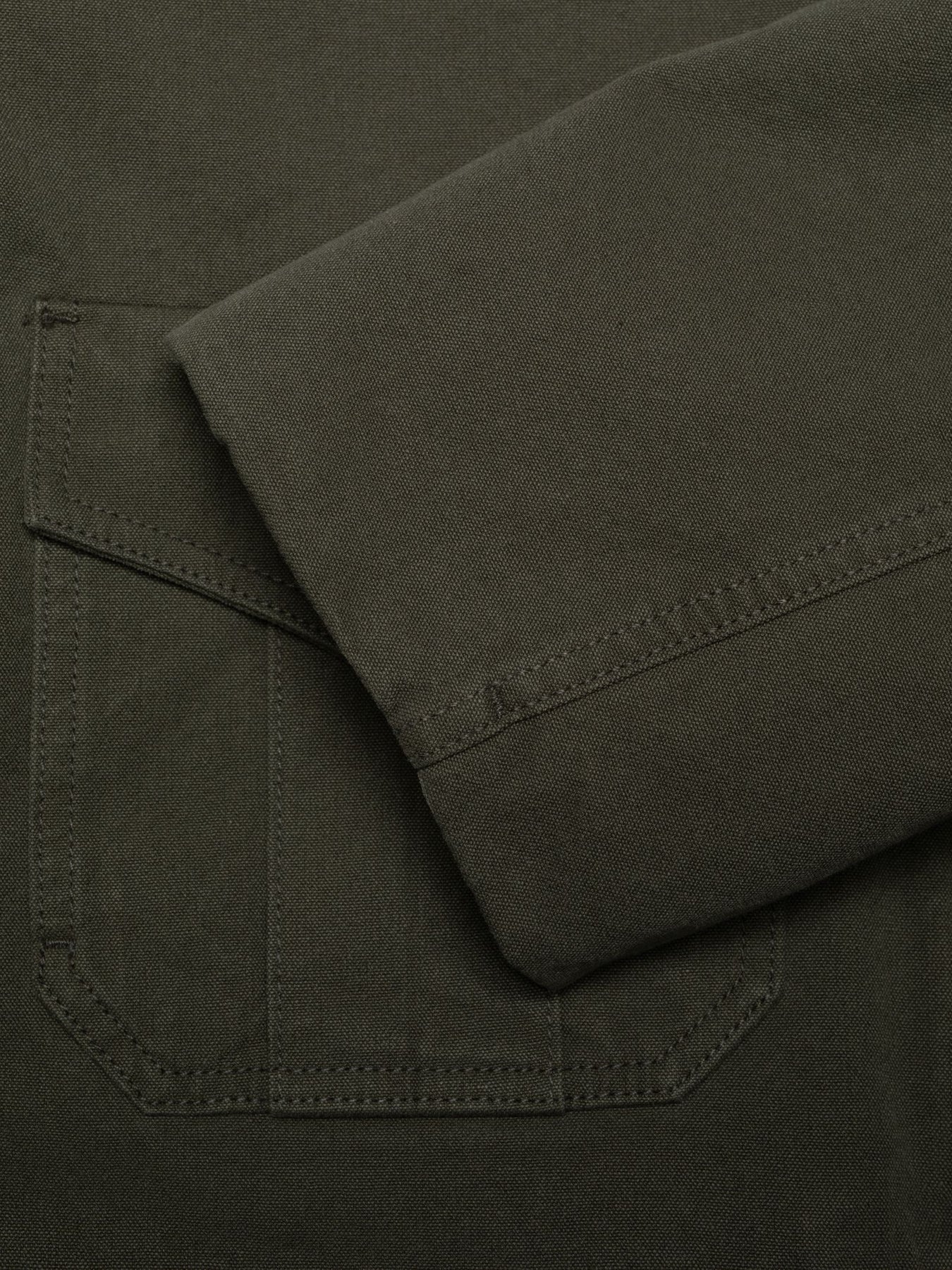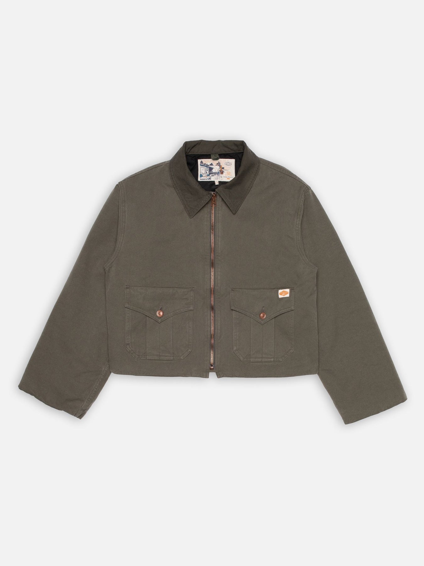 Crafted from our "Duck Canvas," a pale fir-green 2-ply canvas weave, this jacket is detailed with tonal stitching, a stainless steel zipper, and copper buttons. It features patch-on pockets with double functionality: each pocket has a top flap for traditional use, as well as a vertical opening on the side, providing separate spaces for both small items and somewhere to warm your hands. The collar, crafted from the same Duck Canvas in a deeper green shade, adds a subtle tonal contrast, enhancing its workwear-inspired aesthetic.
