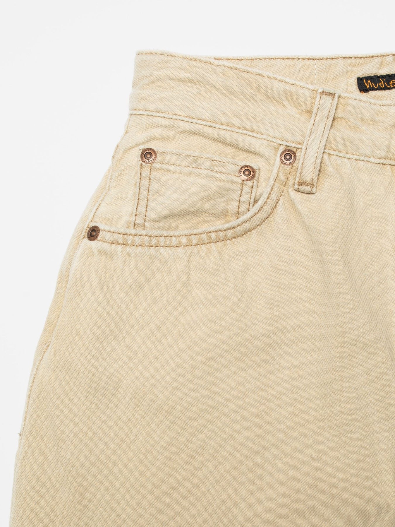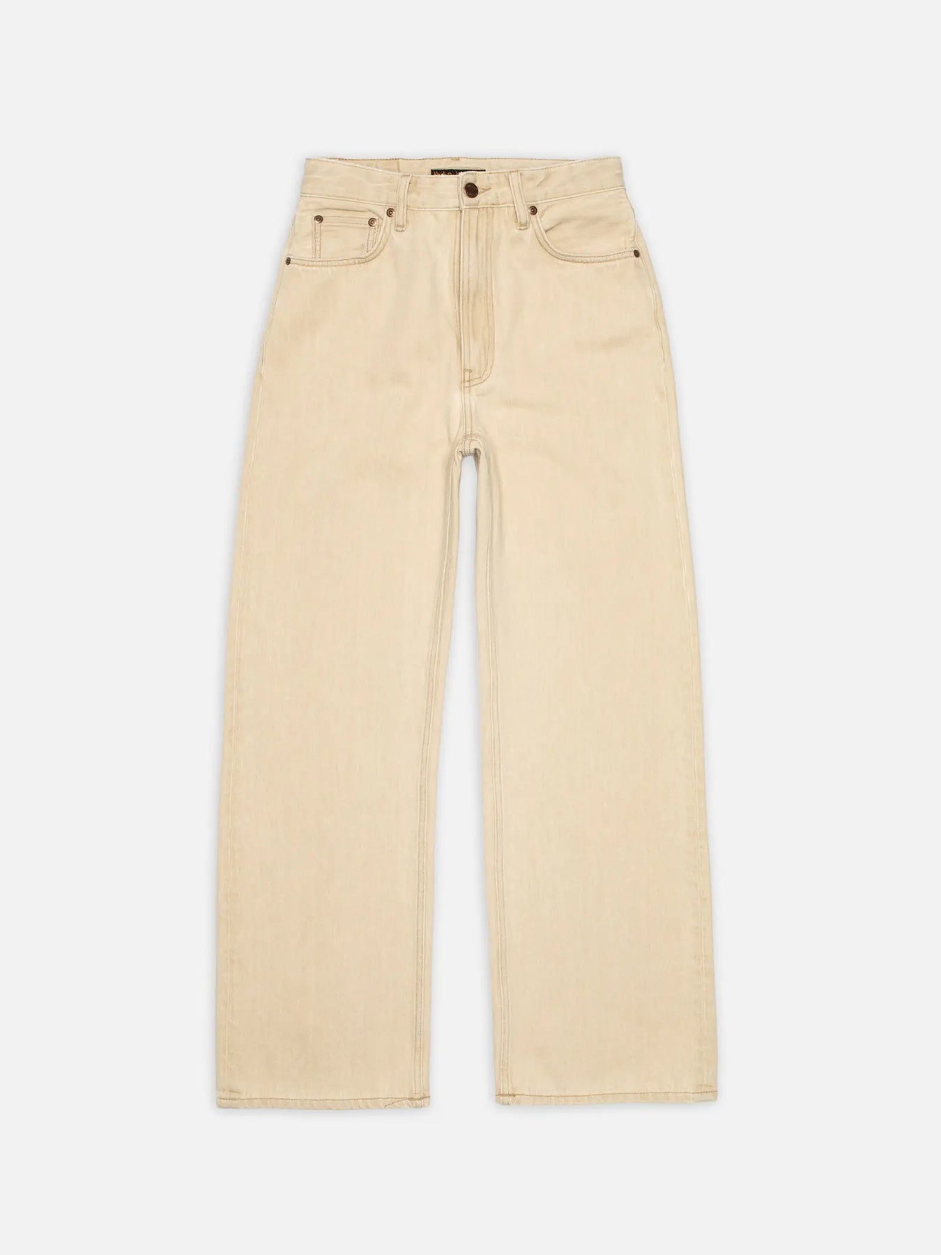 Loose-fit jeans with a high waist and wide leg in a bright, sun-faded brown wash. The denim is quite special—its brown warp yarns are dyed with a natural pigment derived from oak acorns, giving the fabric its distinct tone and indigo-like aging property.