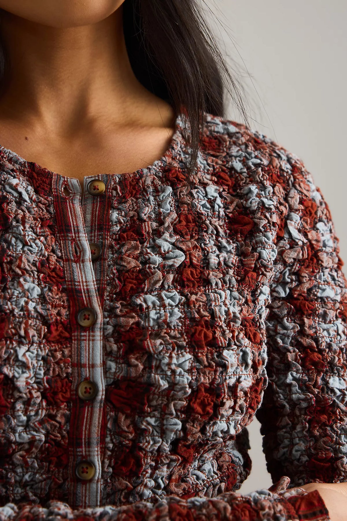 - Button-front, cardigan-style bodice