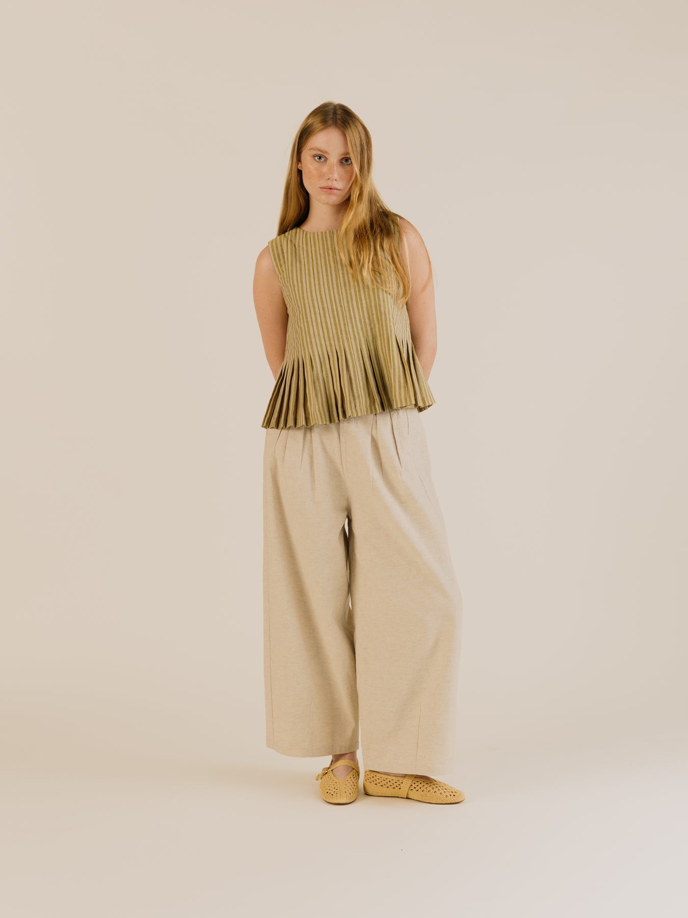 The Leila Trousers are crafted from the most beautiful cotton linen blend fabric with a lovely texture. These trousers fit like a dream featuring an elasticated waist and flat front, inverted front pleats and a side panel creating a loose barrel leg shape.